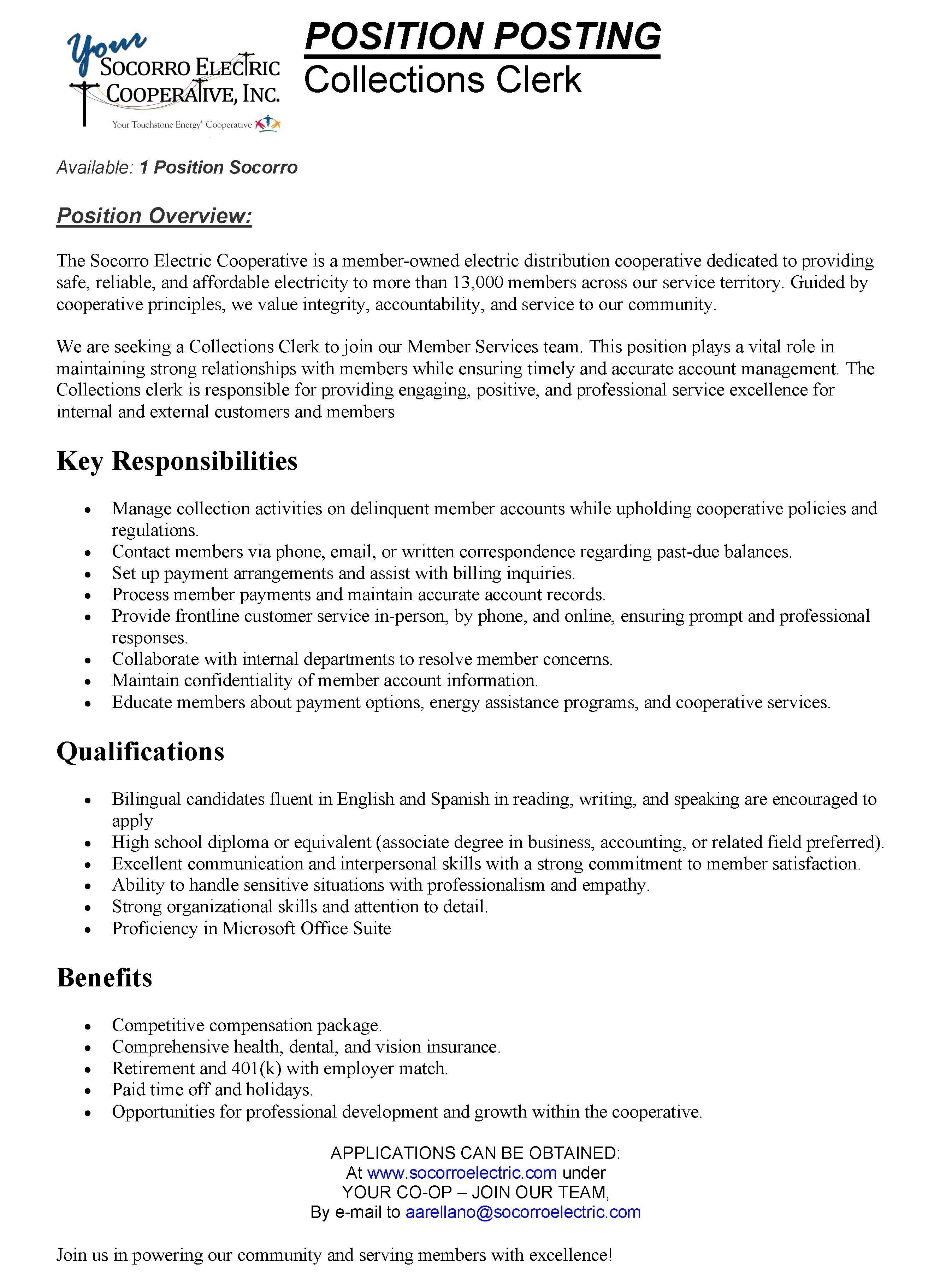 Applications and Job Descriptions can be obtained by calling: Human Resources at 575-835-0560 ext. 1001, or by e-mail to service@socorroelectric.com